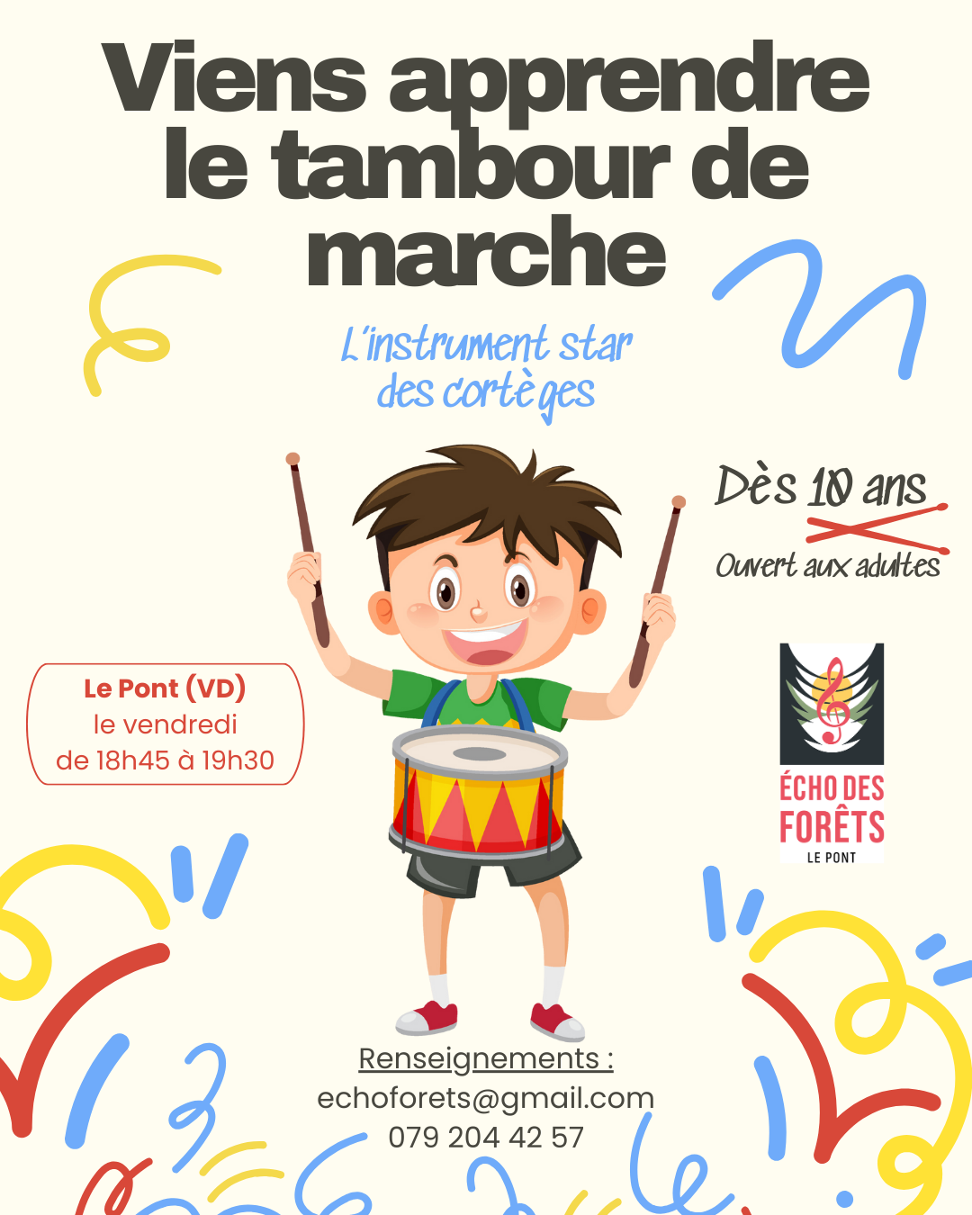 - Tu as envie de découvrir le Tambour ? Nous te formons pour que tu deviennes la star des cortèges, en emmenant toute la fanfare derrière toi !