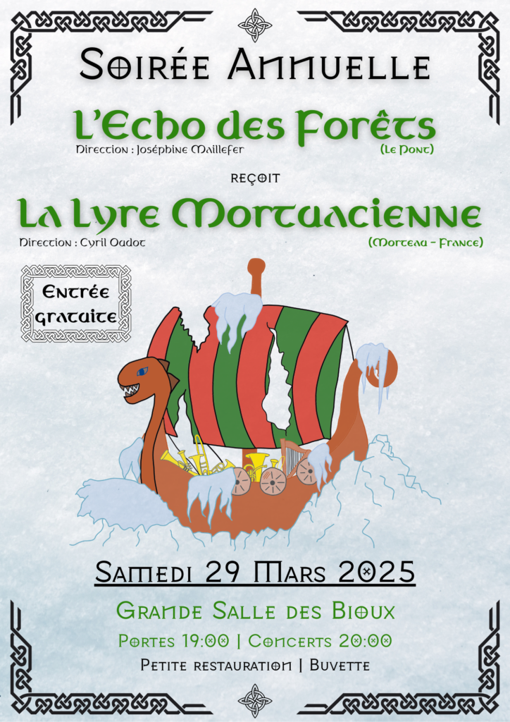 - Samedi 29 Mars 2025 – Soirée annuelle – L’Echo des Forêts reçoit la Lyre Mortuacienne (France) – Les Bioux (VD)